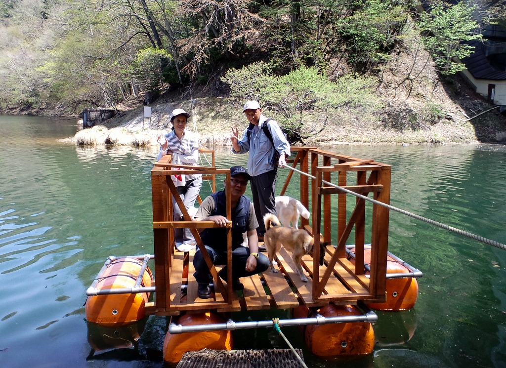 早速お客様たちが乗り、対岸へ渡っています。以前のイカダより水の抵抗が少ないので簡単に渡れますよ。