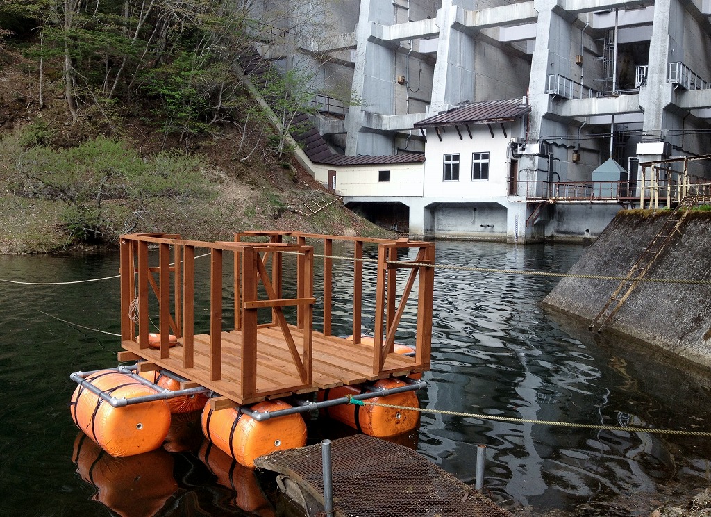 完成したイカダです。後ろに見えているのは重要文化財の丸沼ダムです。