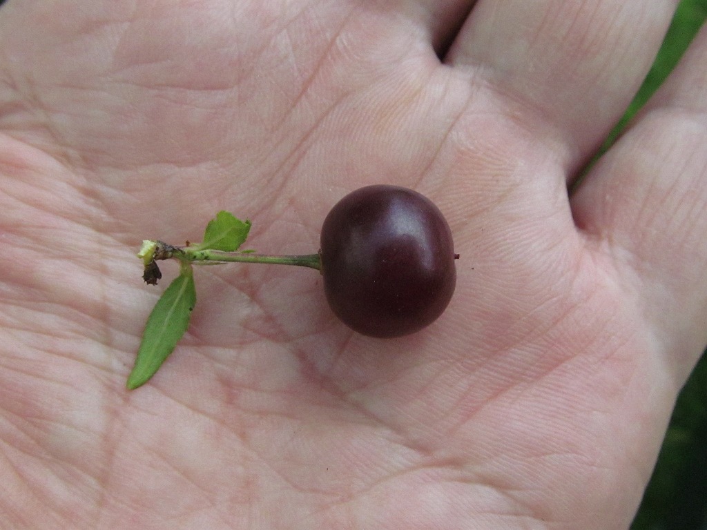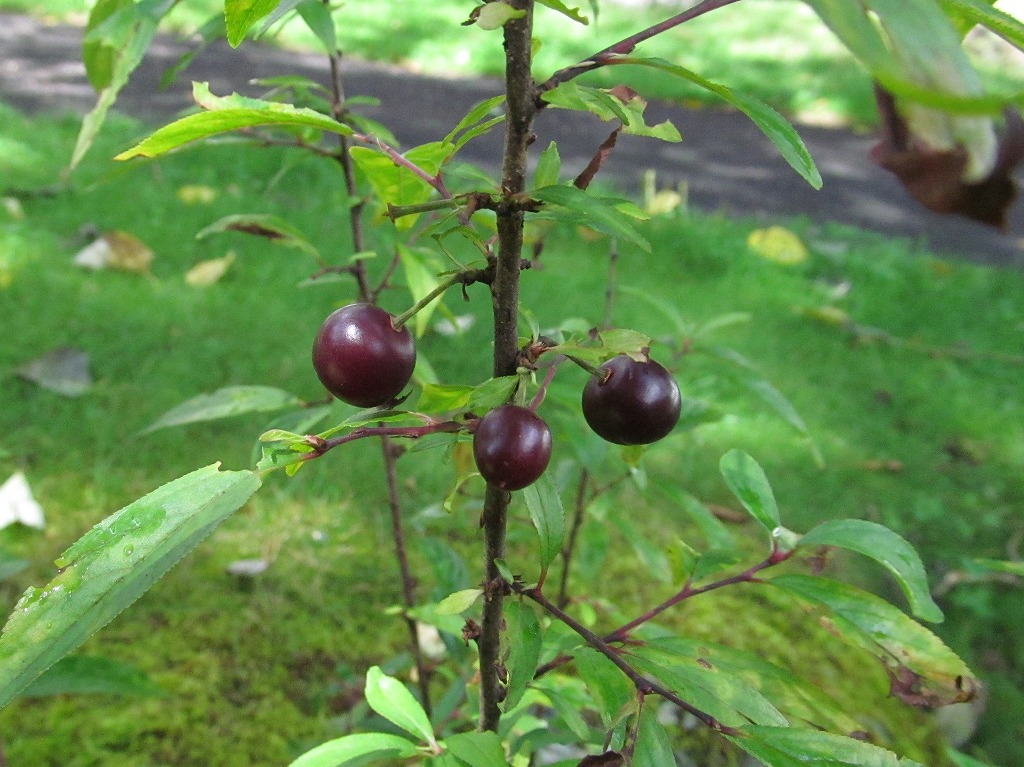 10年以上前に貰って来たユスラウメの木に、今年初めて20個以上の実がつきました。植えた場所が悪かったのか、過去に何度も雪に折られながらも耐え続け、春には可憐な梅のような花が咲いていましたが、受粉がうまくいかず、実をつけませんでした。そんな小さな木でしたが、サクランボのような実をつけたので、じっくりと見てみるとやや黒みがかってユスラウメとはちょっと違う感じです。それで改めて調べてみると、近縁種のニワウメと判明。10年以上ユスラウメと信じて疑いませんでしたが、やっと本当の名前を知りました。食べてみると種が一つありサクランボと良く似ています。来年も、もっとたくさんの実がついてくれると嬉しいですね。