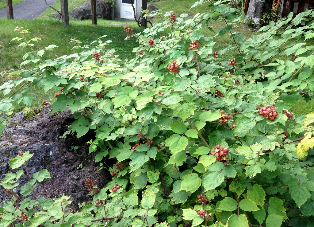 今年も木イチゴが実りました 2016年8月16日 に morinokaze が投稿 — コメントはありません ↓ この辺に自生している木イチゴ。見た目も綺麗で美味しいので、20年位前に近くから採取してきたものです。正確には「エビガライチゴ」といいますが、今年もたくさんの実をつけました。繁殖力が旺盛で、こぼれ種や伸びた枝が地面に着くと、そこにも根が張り増えていきます。我が家では生食で食べたり、冷凍にしてデザートの飾りなどに利用しています。 果実を包むガクにも赤紫色の繊毛が密生していて、エビの頭部や突起のあるハサミなどに似ている事から、命名されたのでしょう。 色が綺麗なので、リンゴシャーベットの飾りにしました。