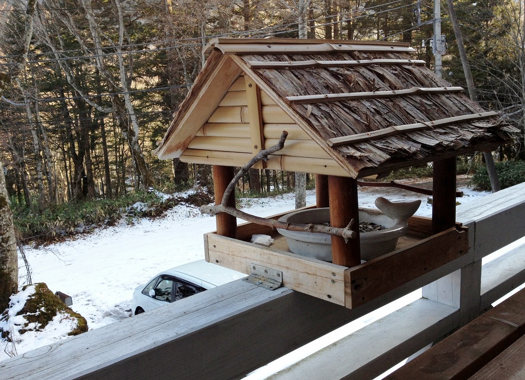 ベランダの手すりに設置した手作りのエサ台