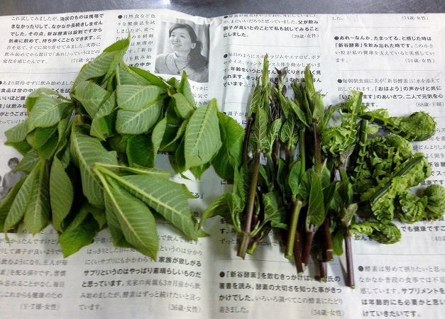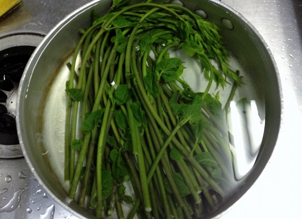 丸沼はこの季節になるとたくさんの山菜が見られます。ペコの散歩途中に少し頂いてきました。左からリョウブ、イケマ、コゴミです。リョウブは漢字で「令法」と書き、昔、お殿様が飢饉に備えて家の庭に植えなさいと、命令したからと言われています。若い葉を食べるのですが、天ぷらにするとクセもなく、もちもちとした食感が楽しめます。まん中はイケマで、根には毒があり鹿も食べません。蔓状に育ちますが、伸びはじめの新芽をいただきます。別名「ゴワラビ」ともいい、茹でると本当にワラビそっくりです。アクがないので何にでも利用できますが、おひたしが甘みがあって美味しいですね。右が山菜の定番コゴミです。今回はイケマが大量に採れたので、一部天ぷらに、残りはおひたしで頂きます。