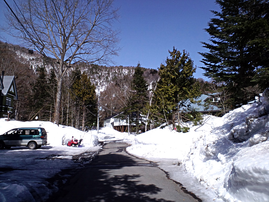 暖かくなってきましたね 2015年3月17日 に morinokaze が投稿 — コメントはありません ↓ ここ丸沼も日曜日から暖かい日が続いています。雪が一気に解け始めていますが、それでも現在の積雪は例年に比べて多いですね。ペンション村内はまだ雪の壁が多く残っており、いつになったら消えるのでしょうか。 お隣の「リトルマウンテン」さん周辺の景色です。道路の雪は消えましたが、周りにはこんなにたくさんの雪が・・・ 「森の風」のベランダも、たくさんの雪が積もっていた為に部屋から外に出られませんでしたが、ここ数日でやっと消えてホッとしています。 森の中も雪が深くて散歩が出来ませんでしたが、3月に入り雪が締まってきたのでスノーシューがなくても歩けるようになりましたよ。これから散歩が楽しくなりそうです。