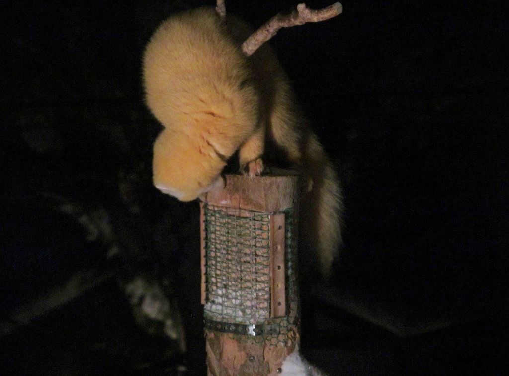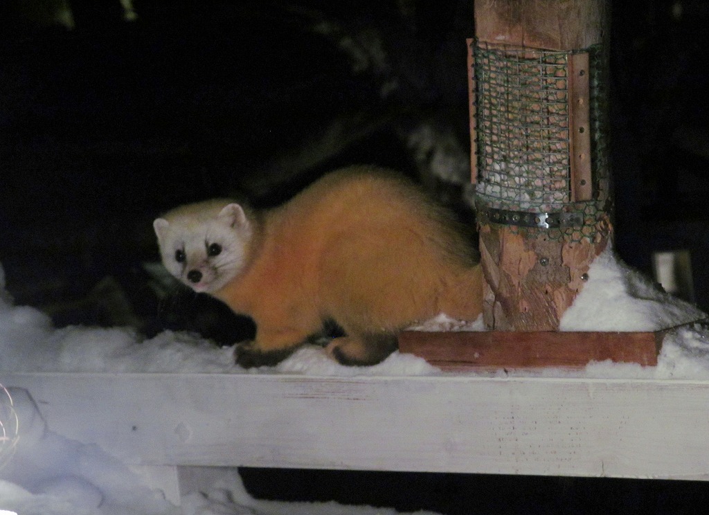最近、野鳥のエサが異常に減っています。毎日、野鳥の為に、豚の脂身とヒマワリの種を置いておくのですが、翌日にはきれいになくなっているのが続いていました。リスがやってくるとヒマワリの種は一気になくなるのですが、最近は豚の脂身もなくなっているので、肉食獣だと思っていましたが案の定、正体は『テン』でした。器用に上の方から、すき間に手を入れて脂身を持っていきます。これからは、昼間は小鳥に、夜はテンの為にエサを置いておきましょう。テンは冬と夏では毛の色が変わるんですが、顔の色が白くなる冬のテンは本当にかわいいですね。