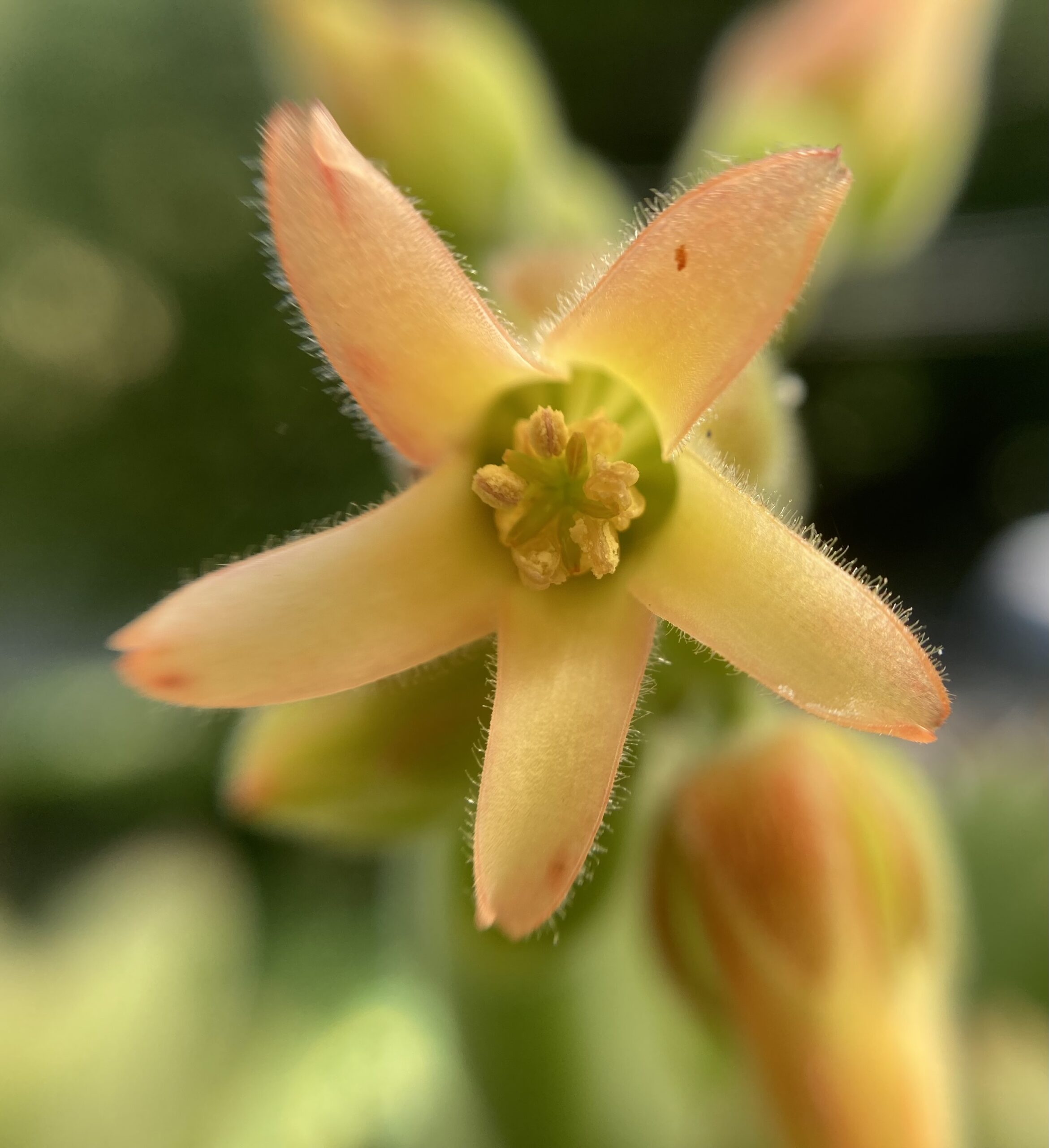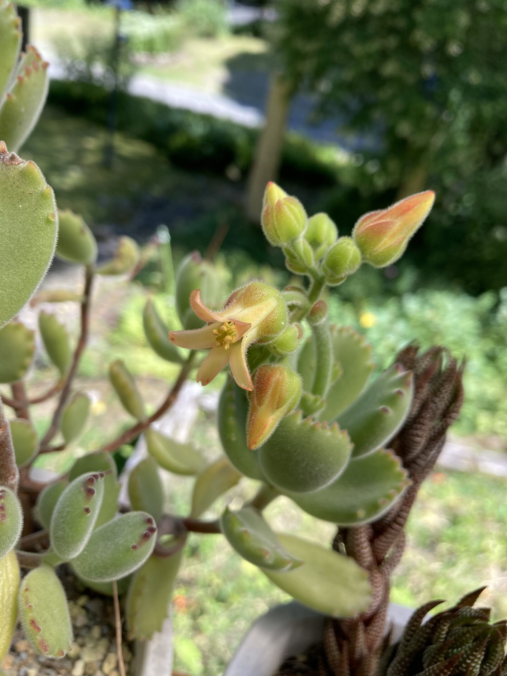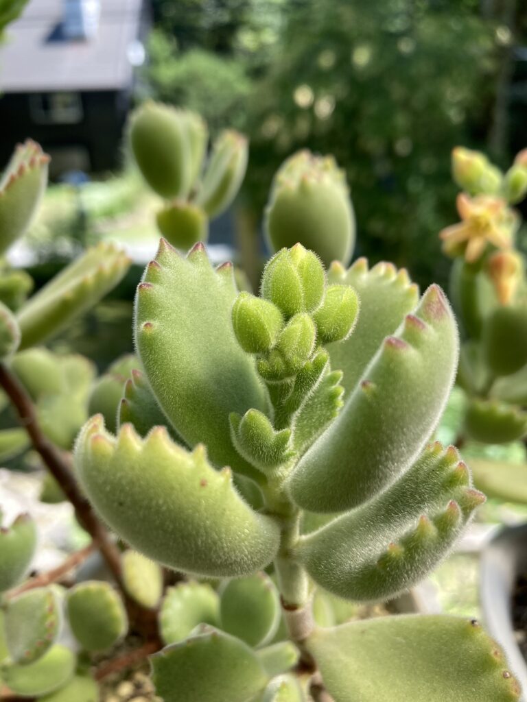 熊童子の花 2025年9月7日 に morinokaze が投稿 — コメントはありません ↓ たくさんある多肉植物の中でも、可愛いくて大好きな熊童子です。名前の通り小熊の小さな手を思い起こしますが、久しぶりに花が咲きました。 ご覧のように葉の先が細かく分かれており、まるで小熊の爪のようです。 葉の間から蕾が出てきました。 茎が伸び、花が咲き始めました。 クローズアップするとこんな感じ、葉と同じく細かい毛が見えます。