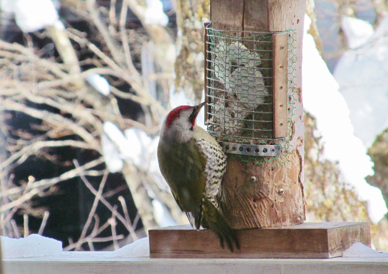 珍しいお客様 2016年2月3日 に morinokaze が投稿 — コメントはありません ↓ 気持ちよく晴れ渡った1日です。放射冷却のせいで朝の気温はマイナス10℃と寒かったですが、風もなく晴天で、気温も上がった昼過ぎに大きな鳥がやってきました。キツツキの仲間『アオゲラ』です。鳩くらいの大きさで特徴的な赤い冠が目立ちます。全体がウグイス色で、名前の由来になっています。同じ仲間の『アカゲラ』はよくやって来るのですが、『アオゲラ』は久しぶりの登場です。普段は枯れた木の幹に穴を開け、昆虫をエサにしていますが、えさ台に付けた豚の脂身を無心につついていました。