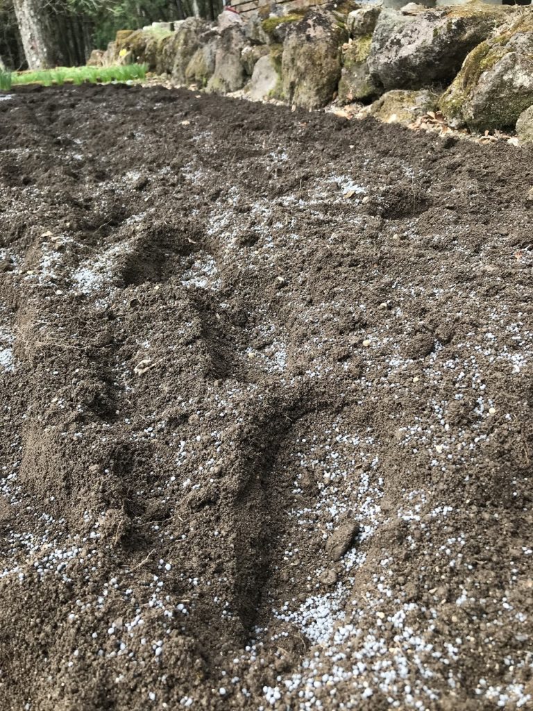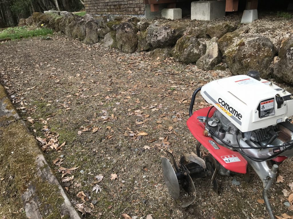 雪が消えて、春最初の仕事です。硬く締まった畑をミニ耕運機で耕します。猫の額ほど小さな畑ですが、柔らかく耕すのは結構辛い仕事なので、強い味方です。年に一度の出番で、毎年エンジンがかかるか心配ですが、今年も一発でかかり一安心。耕した後は肥料を入れて数日おいてから、ナスタチューム(花)の種を蒔きます。