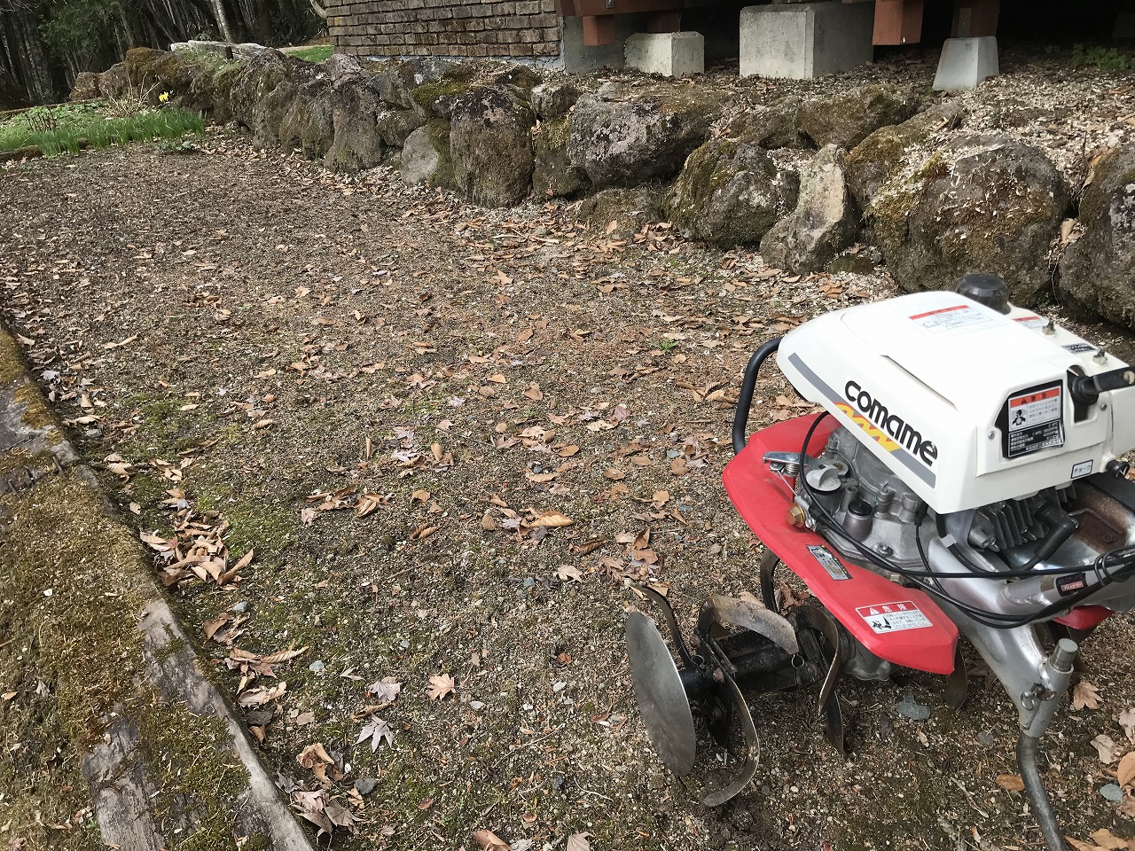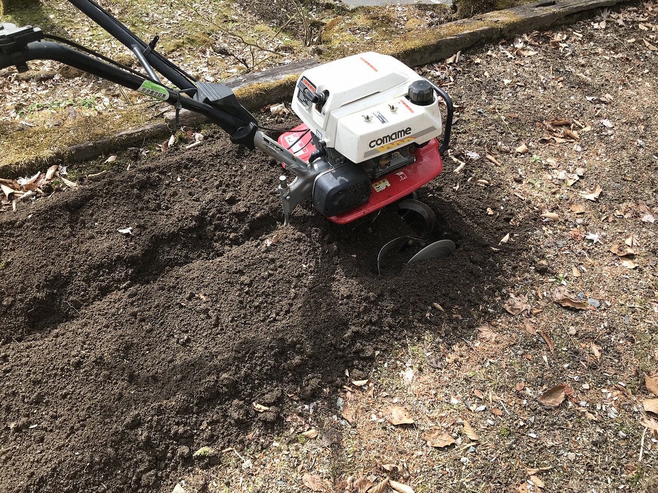 こんなに小さな機械でも、手で耕すとは雲泥の差があります。見る見るうちに硬かった土がふかふかになって行きます。