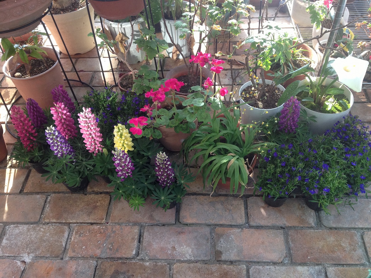 サンルーム内に避難した春植えの苗です。今年はルピナスとロベリアを購入。