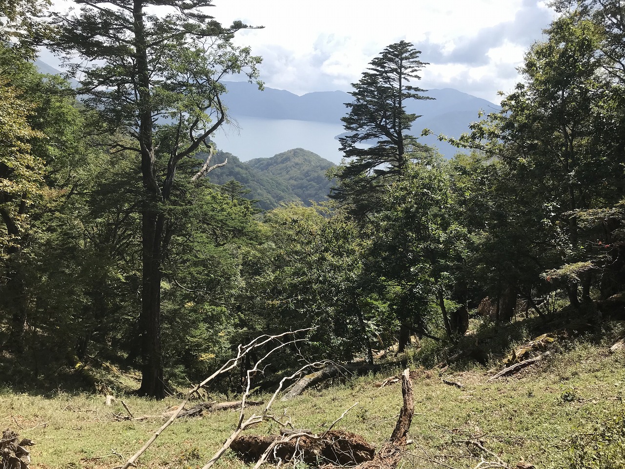 登り切って尾根の間から中禅寺湖が見えます。