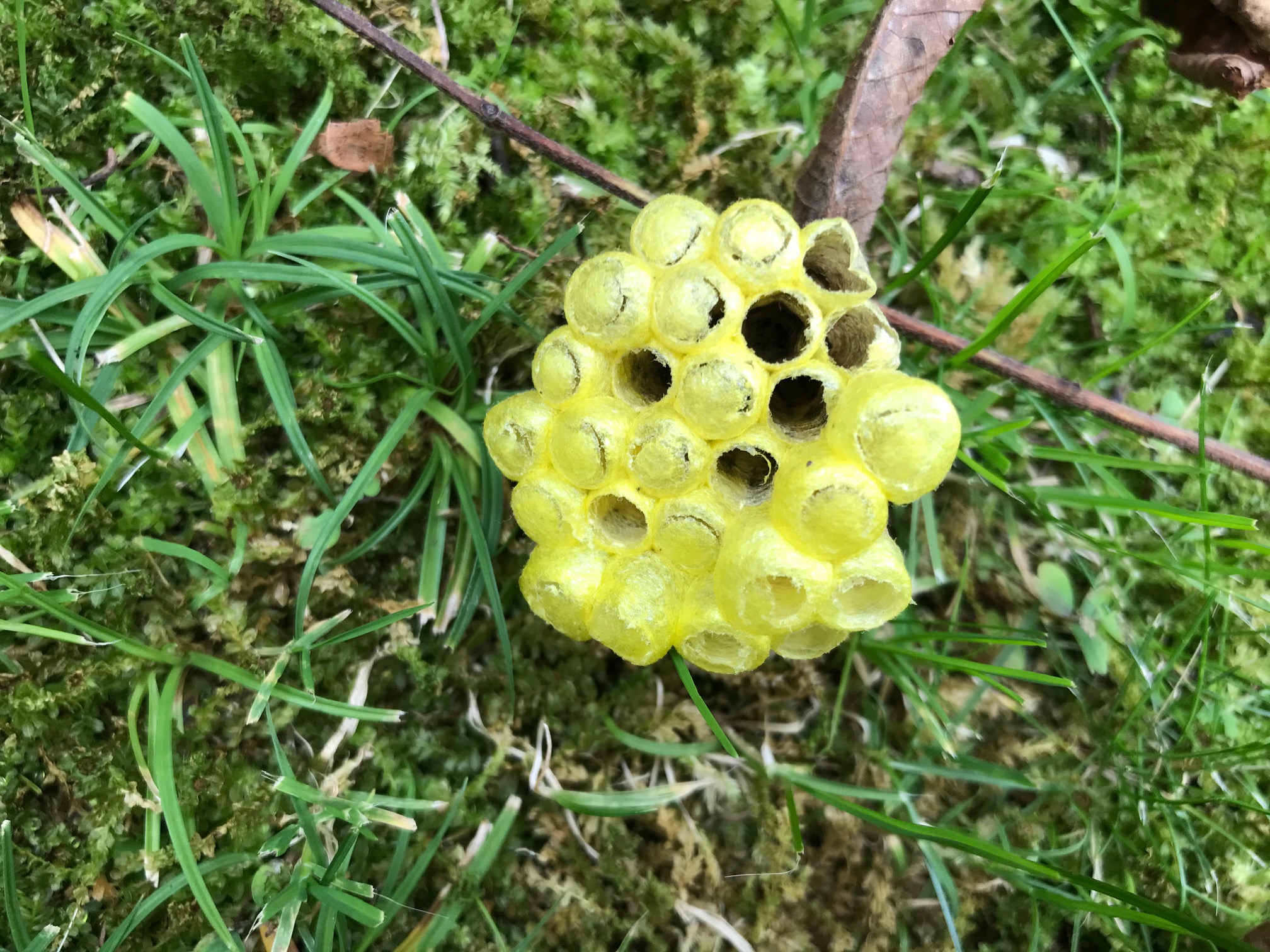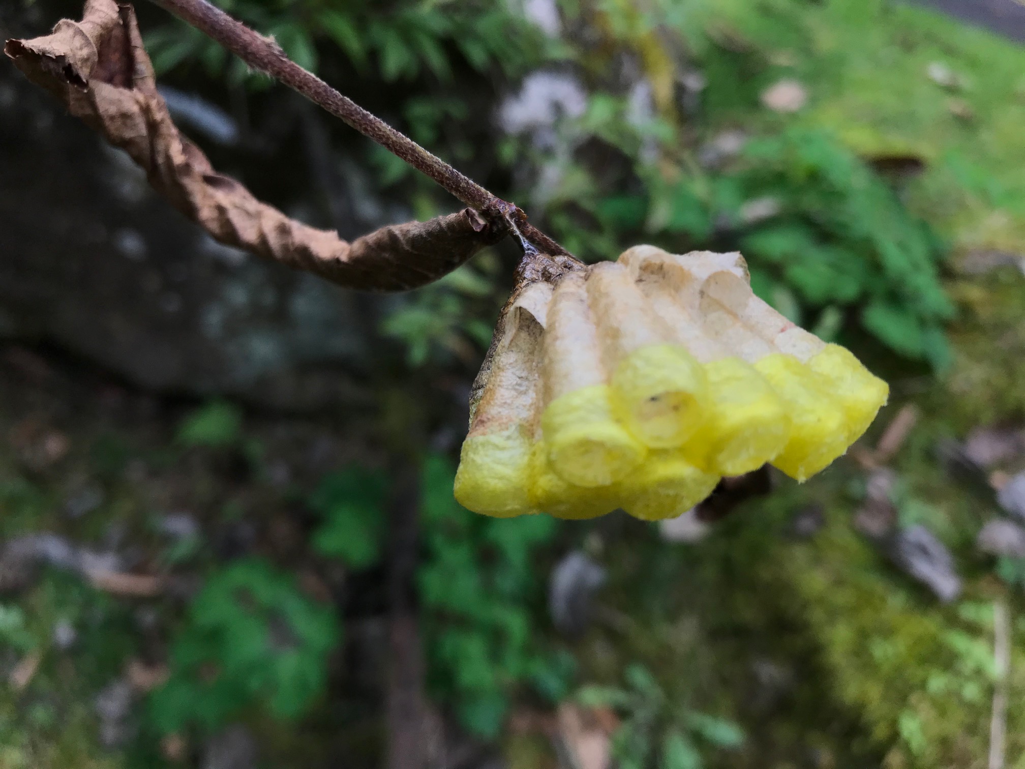黄色いハチの巣 2020年10月6日 に morinokaze が投稿 — コメントはありません ↓ 丸沼ではいろいろなハチの巣を見ていますが、こんな蛍光色のハチの巣は初めて見ました。どうやら庭の「サワグルミ」の木に作ったみたいですが、落ち葉の季節になり枯葉とともに落ちてきたみたいです。早速写真を撮り、検索アプリで調べてみると名前がわかりました。「キボシアシナガバチ」もちろん初めて聞く名前です。検索アプリすごいです。素晴らしい時代になりましたね。
